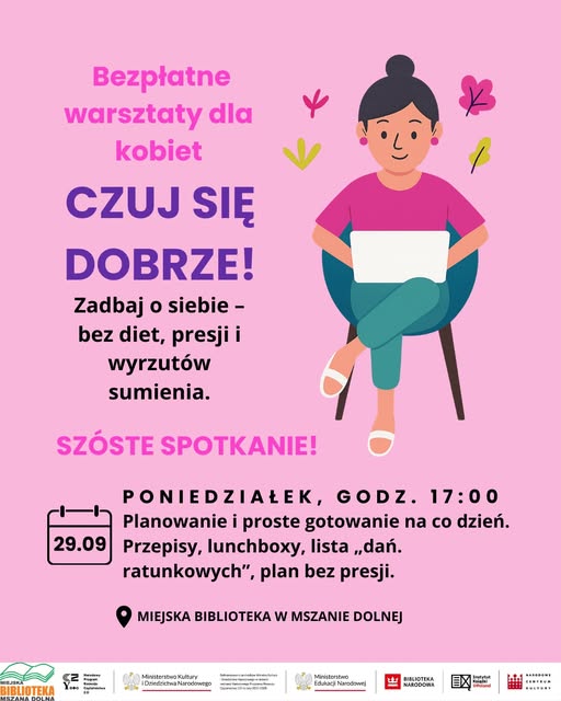 Zapraszamy do udziału w bezpłatnych warsztatach dla kobiet ” Czuj się dobrze”. Zadbaj o siebie- bez diet, presji i wyrzutów sumienia. Każda chwila dla siebie jest bezcenna.