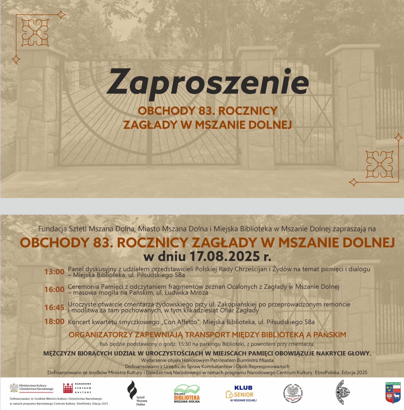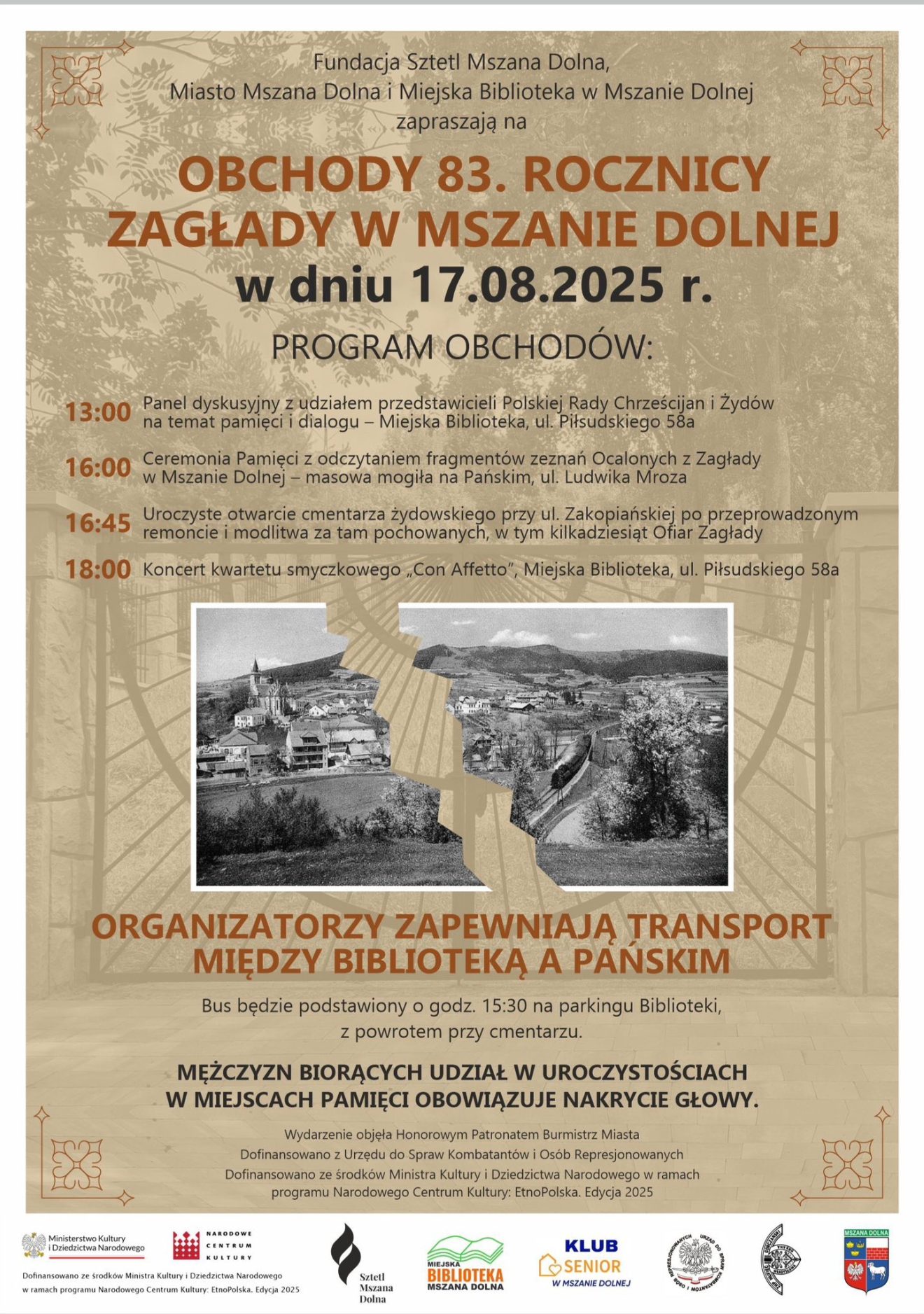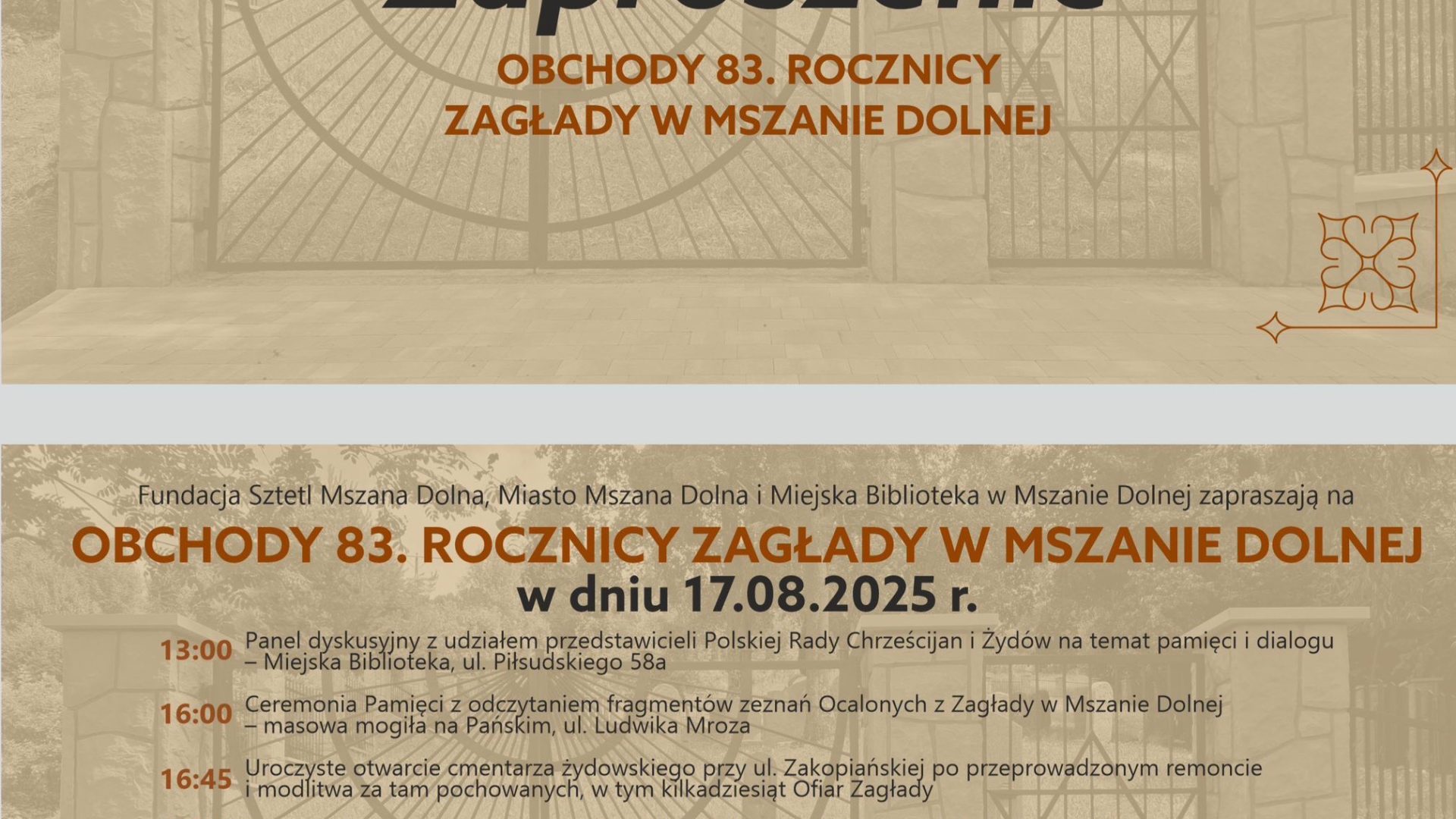 W imieniu organizatorów – Stowarzyszenia Sztetl – oraz jako współorganizator, Miejska Biblioteka Publiczna w Mszanie Dolnej serdecznie zaprasza na obchody 83. Rocznicy Zagłady – tragicznych wydarzeń, w których nasze miasto straciło ponad tysiąc obywateli. Wśród ofiar byli Żydzi z Mszany Dolnej i okolic, przesiedleni z innych miejscowości oraz chrześcijanie żydowskiego pochodzenia.