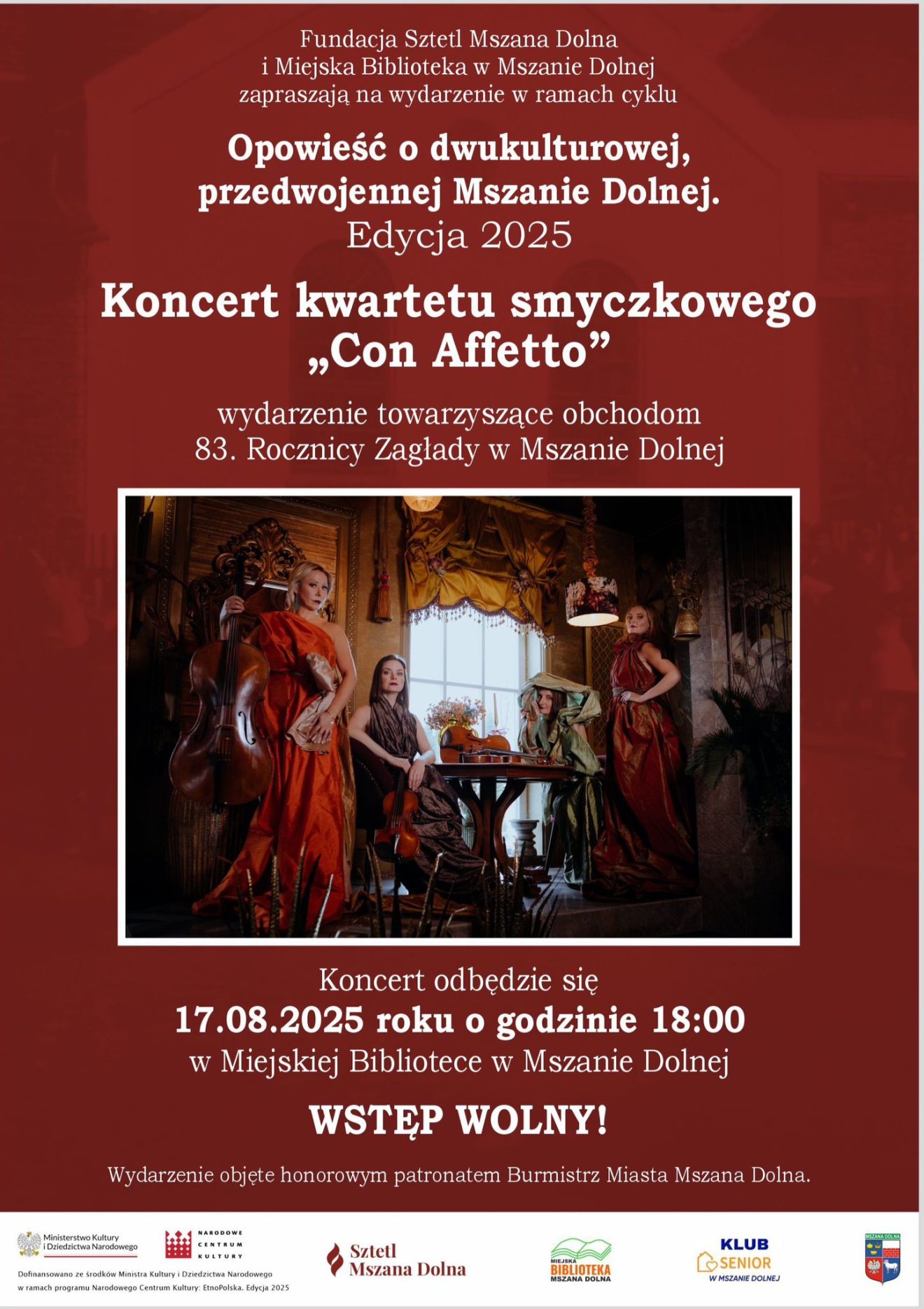 • 18:00 – Koncert Kwartetu Smyczkowego „Con Affetto” – Miejska Biblioteka Publiczna, ul. Piłsudskiego 58a (wstęp wolny)